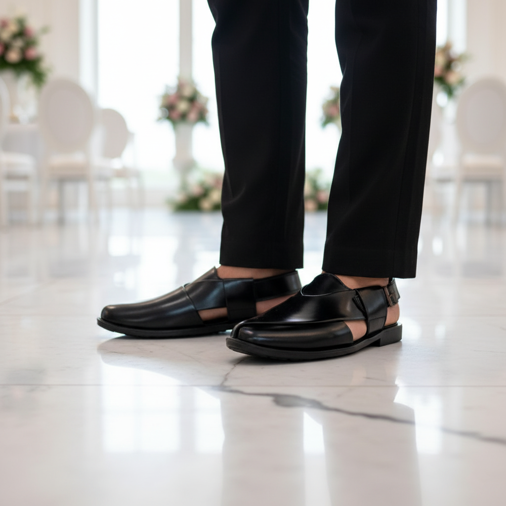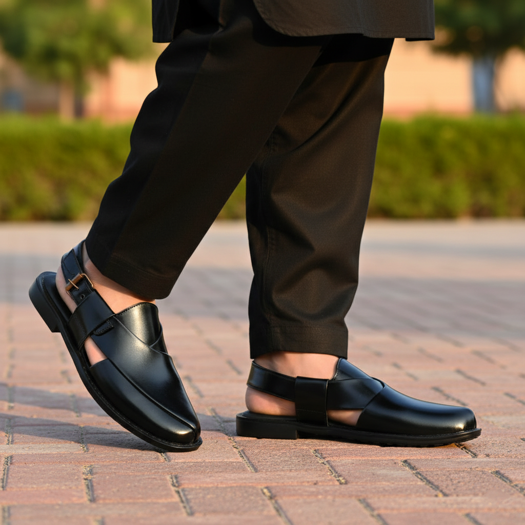 Modern Peshawari shape with a clean black finish. Soft padding and airy cutouts keep feet cool. Buckle fit stays secure. Strong grip for city roads and bazaars. Wipes clean fast. Looks smart with jeans or shalwar kameez, all day.